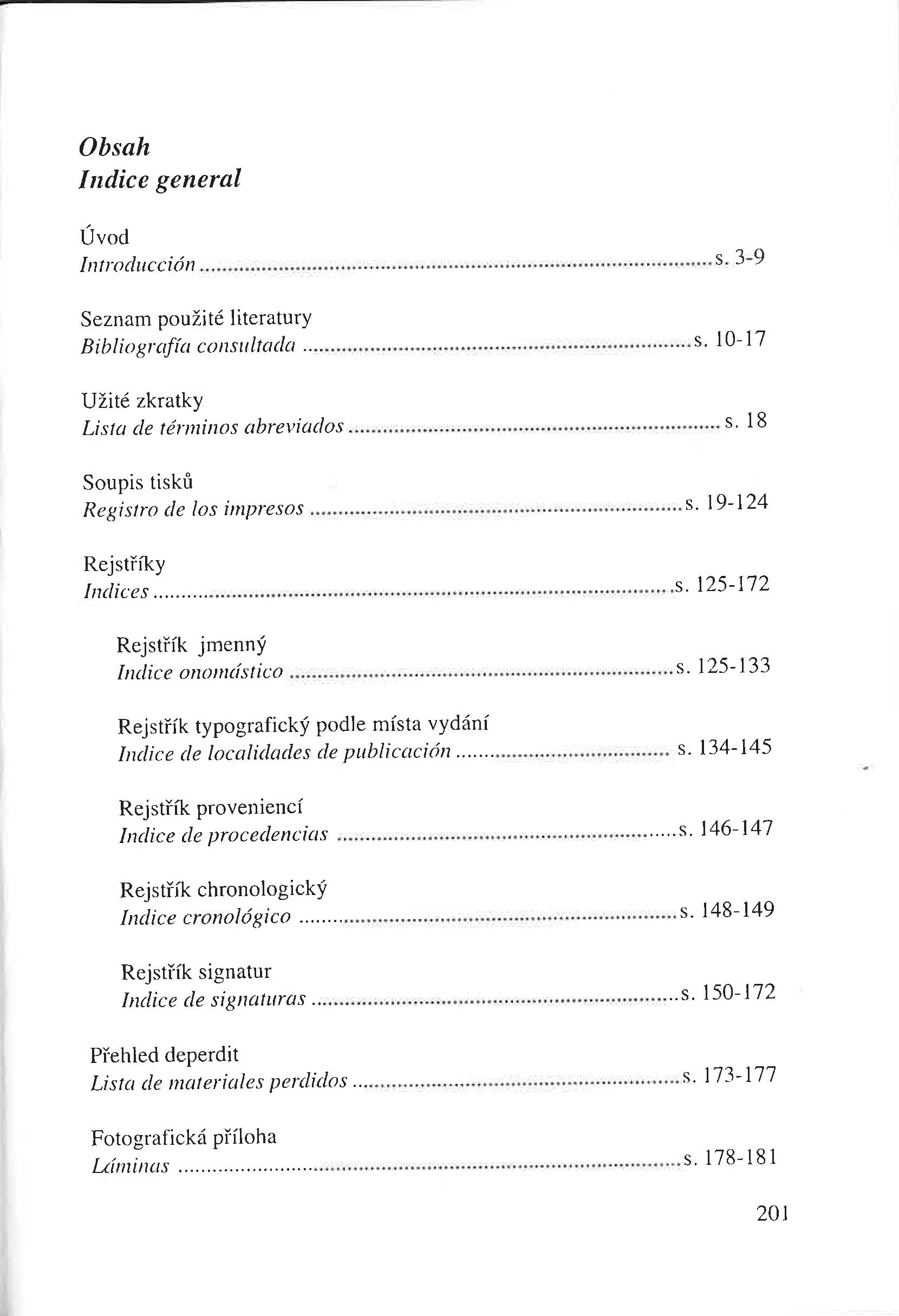 Úvod a popisky obrázků v češtině a španělštině; rejstříky jmenný, typografický podle místa vydání, proveniencí, chronologický a signatur; přehled deperdit.