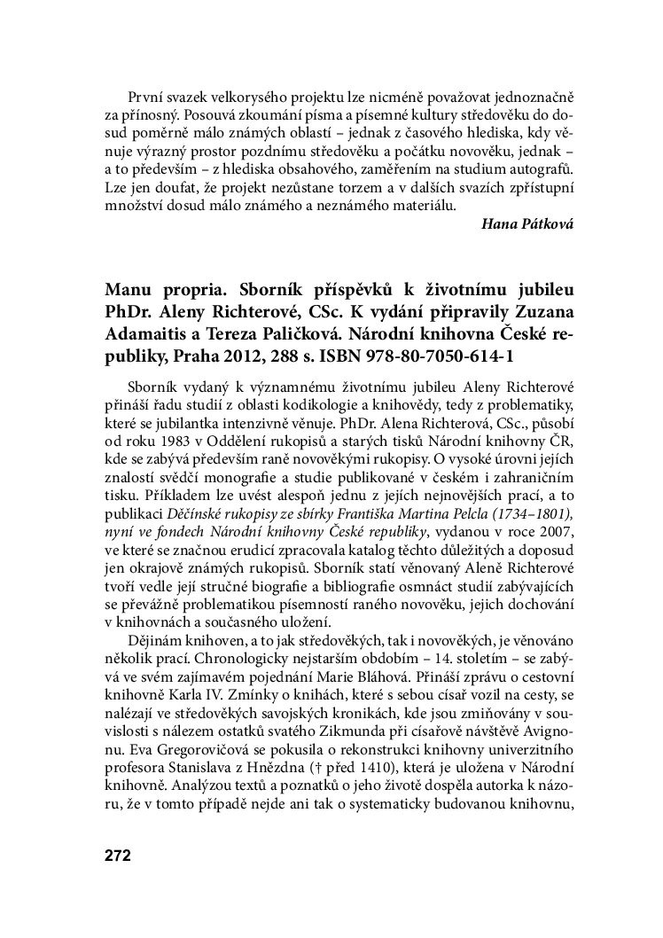 Zuzana Adamaitis – Tereza Paličková (eds.): Manu propria… Sborník příspěvků k životnímu jubileu PhDr. Aleny Richterové, CSc.